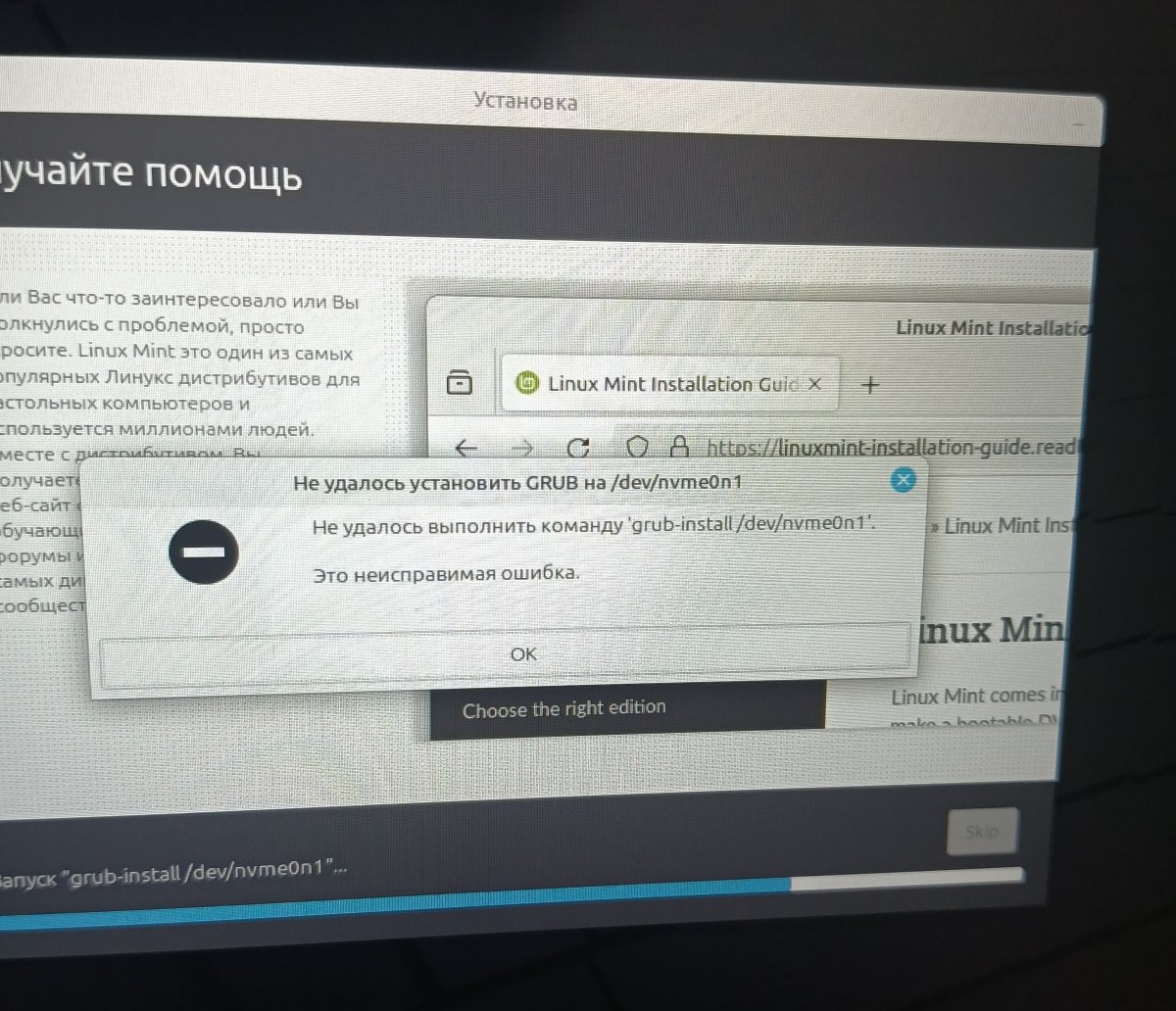 Приветствую всех! Столкнулся с такой проблемой, на новом ноутбуке решил поставить Mint, при установке вылазит ошибка (картинка ниже). Что может быть? Пробовал ставить Linux Mint 22.2 и 22.3. Ноутбук такой: https://www.wildberries.ru/catalog/687265298/detail.aspx?targetUrl=SN